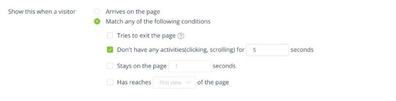 条件設定を行い、ユーザーが不便を感じ無いよう細心の注意を払い、良い体験を提供することを心がけましょう。ユーザーがページの何パーセントの内容を読んだ時といった指定や、あなたのウェブサイト上でどれぐらいの時間を満たした時など、条件を設定してそれに当てはまるユーザーだけにテストが実施されるようにするのです。以下では、コンバージョン改善のため設定できる条件の例を挙げます:
